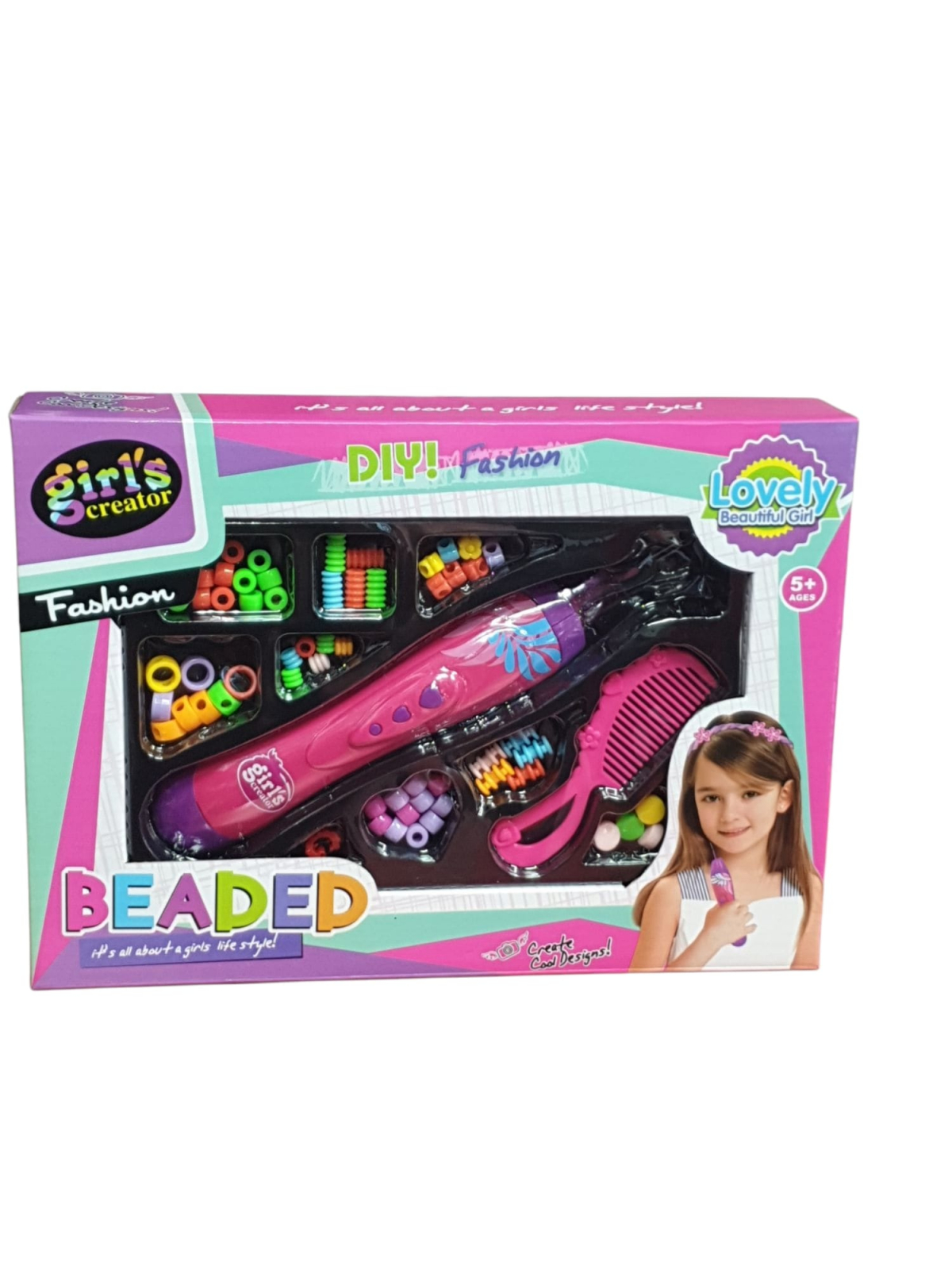🔹 Include: mărgele de diferite forme și culori, dispozitiv de aplicare, elastice și accesorii pentru coafură